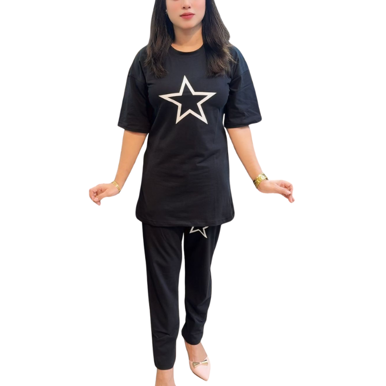টপ ও প্যান্টে ম্যাচিং স্টার প্রিন্ট—ইউনিক ও স্মার্ট লুক।