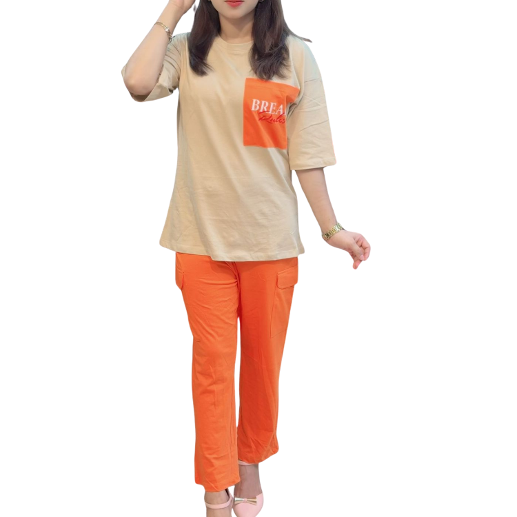 বেইজ টপ + অরেঞ্জ প্যান্ট—ফ্রেশ ও নজরকাড়া লুক।