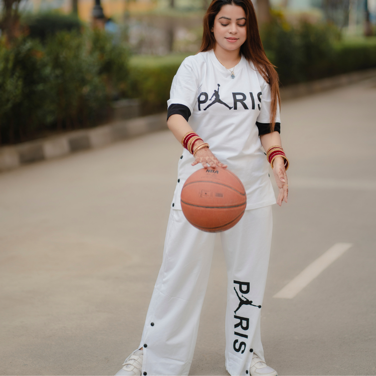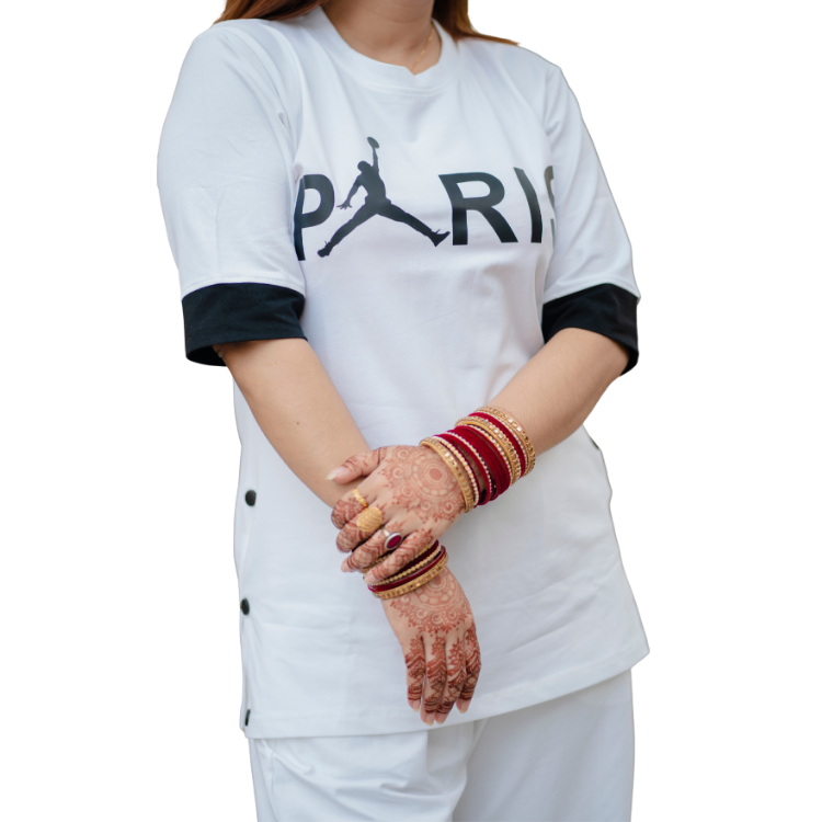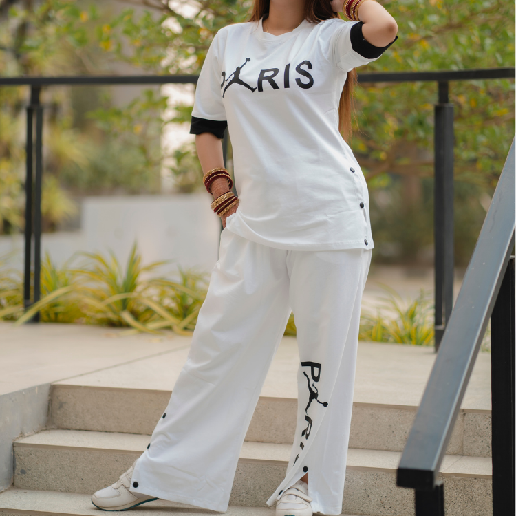 ডিটেইলস: প্যান্টের পাশে ভের্টিকাল “PARIS” প্রিন্ট ও নীচে বাটন-স্লিট ফিনিশ — ট্রেন্ডি লুক ও ভ্যারিয়েবল স্টাইলিং (বাটন খোলা/বন্ধ করে সৌন্দর্য পরিবর্তন করা যায়)।