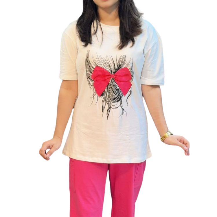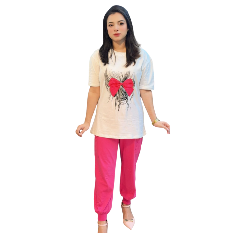 এই টু-পিস সেটটি প্রিমিয়াম কটন-LYCRA জার্সি ফ্যাব্রিকে তৈরি। টপটি সফট ও ব্রিদেবল কটন-রিচ হওয়ার কারণে গায়ে হালকা ও আরামদায়ক লাগে, আর বটমে লাইক্রা স্ট্রেচ থাকায় স্মার্ট ফিট ও ফ্রি মুভমেন্ট নিশ্চিত করে। সামনে কিউট বাউ/রিবন গ্রাফিক প্রিন্ট সেটটাকে ট্রেন্ডি ও ইয়ুথফুল লুক দিয়েছে—ডেইলি, হোম বা ক্যাজুয়াল আউটিংয়ের জন্য পারফেক্ট।
