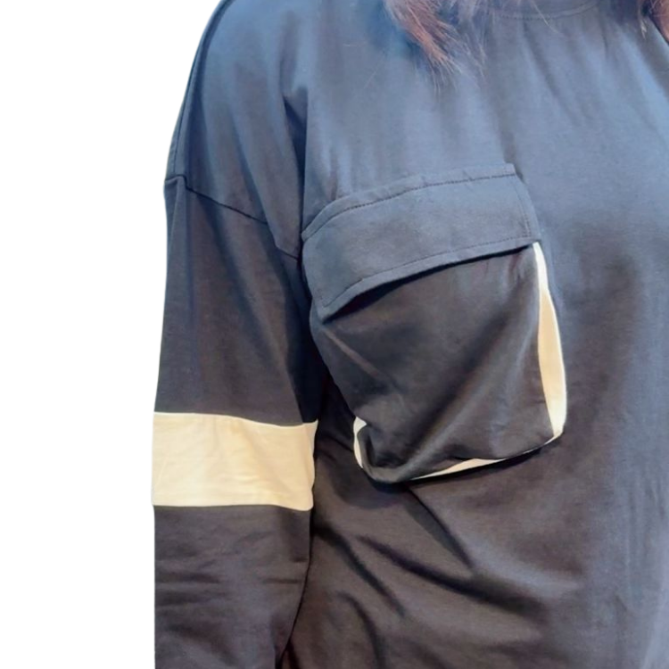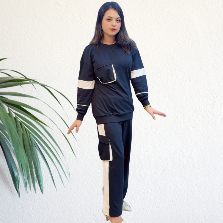 with our Terry Fabric Co-Ord Set in a chic navy blue and white panel